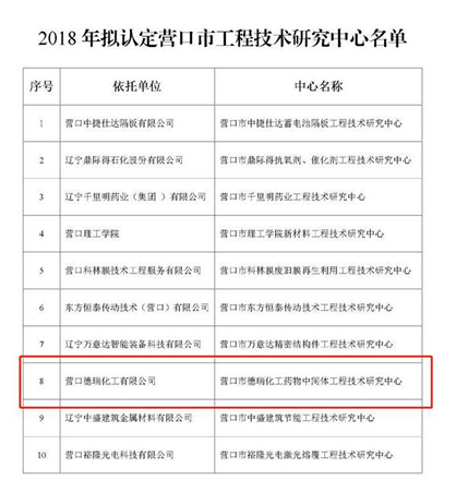 2018年11月9日,營口市科學(xué)技術(shù)局公布了關(guān)于擬認(rèn)定2018年營口市工程技術(shù)研究中心的公示,依托營口德瑞化工有限公司申報的“營口市德瑞化工藥物中間體工程技術(shù)研究中心”被列入2018年度市級組建計劃中。